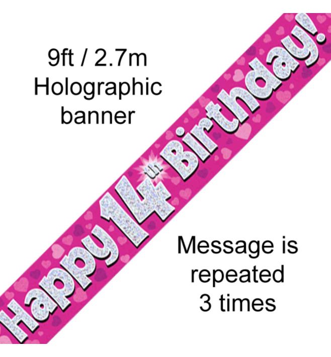 9ft Oaktree Happy 14th Birthday Pink Holo Banner