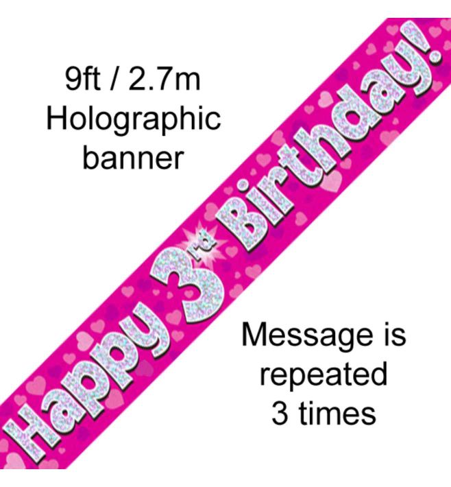 9ft Oaktree Happy 3rd Birthday Pink Holo Banner
